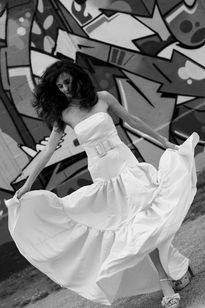 Vous l'aurez compris cette collection est une ode aux années 80. Chaque look a été pensé comme un hommage aux artistes et chansons emblématiques de mon enfance, Madonna, Micheal Jackson, Prince, Davis Bowie, Cyndi Lauper, Whitney Houston, Flashdance, Roxy music. Les lignes sont affirmées, pures pour laisser les matières parler d'elles-mêmes. Satin duchesse et crêpe de satin s'associent délicatement au lamé, dentelles et perles.